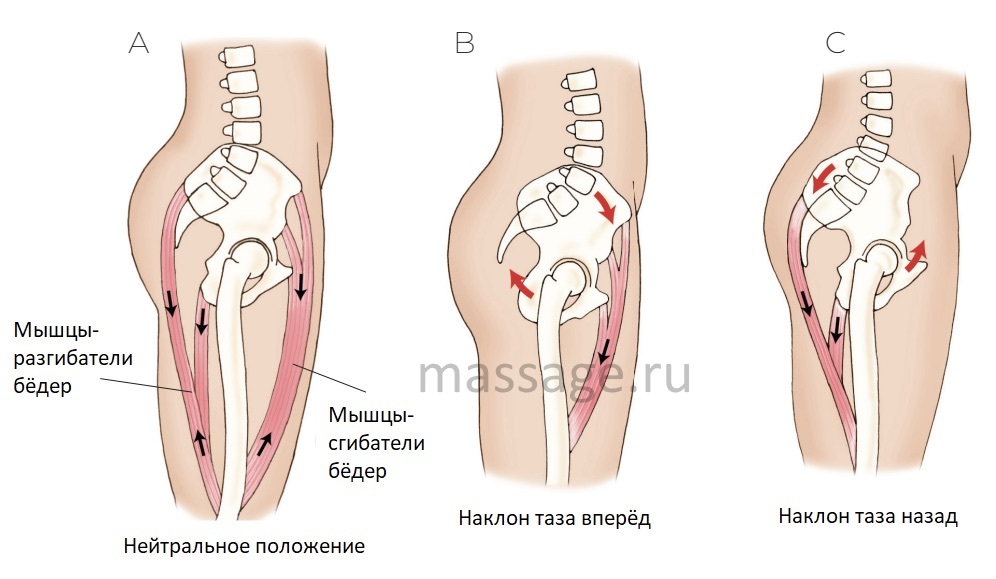 А если плохая растяжка у задней поверхности бедра, то таз, наоборот, стремится назад, поясница уплощается и пропадает функция амортизации позвоночника (картинка С). Это чревато нарушением осанки и появлению протрузий/грыж.